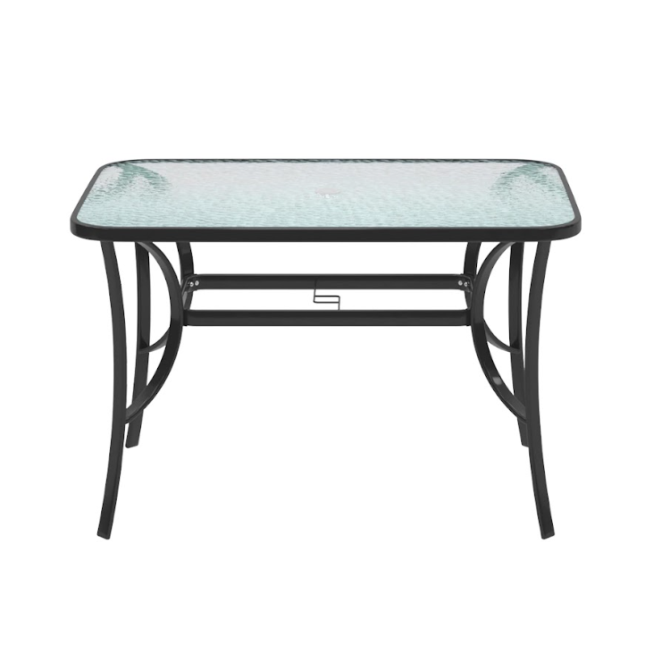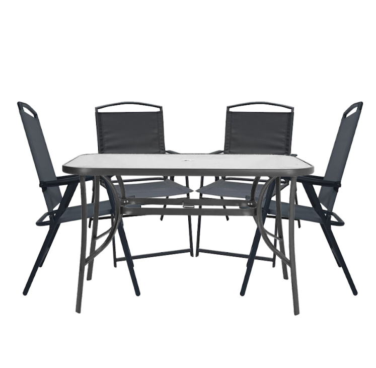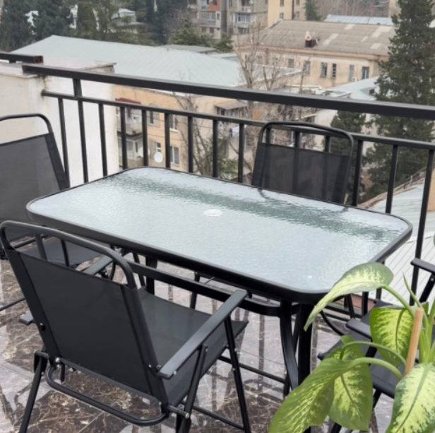 ნაწრთობი მინის მაგიდა, მეტალის კარკასით და მეტალის დასაკეცი სკამი სკამი, მსუნთქვამი ტექსლინის ზედაპირით თქვენს ინტერიერსა თუ ექსტერიერს შესძენს მყუდროებას და გამორჩეულ დიზაინს.