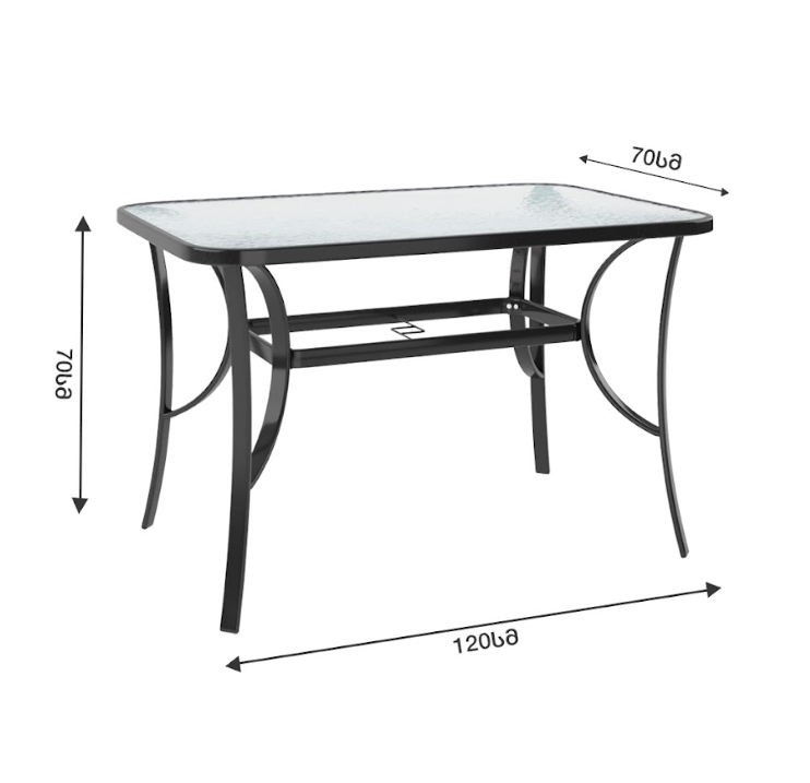 ნაკრებში შედის 1 მაგიდა ქოლგის სამაგრით ზომით : 120*70*70