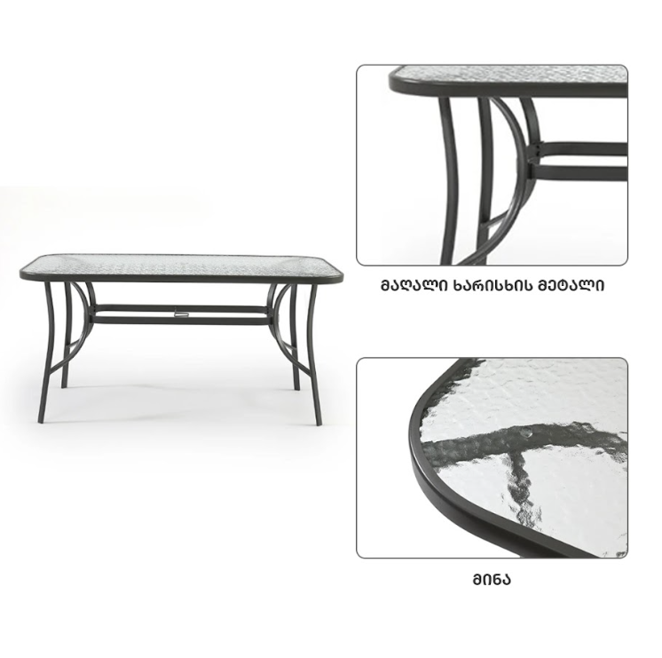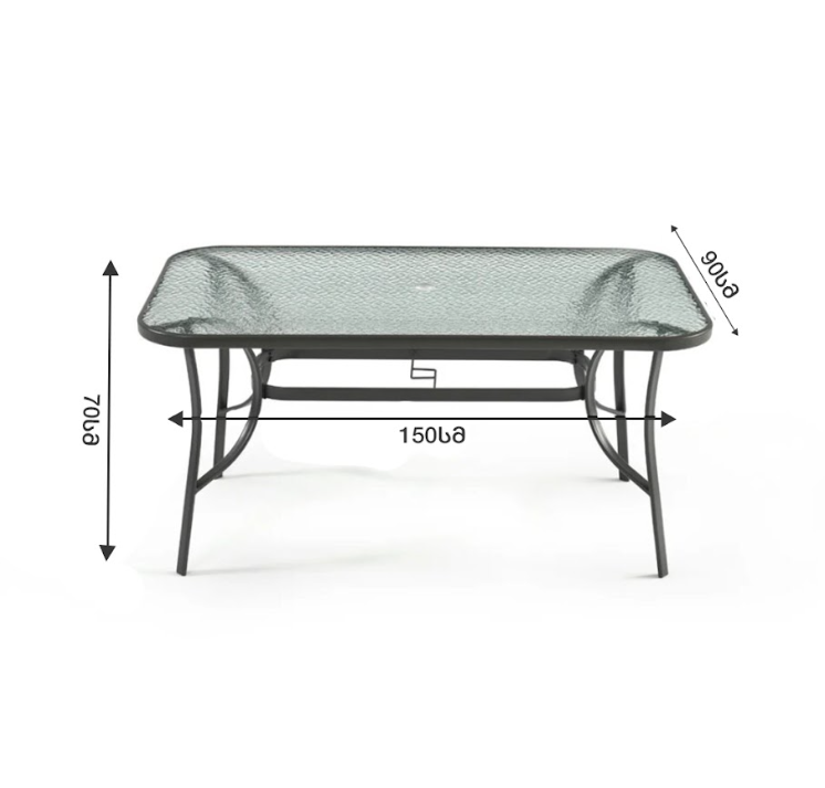 ნაკრებში შედის 1 მაგიდა ქოლგის სამაგრით ზომით : 150*90*70