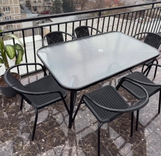 წრთობი მინის მაგიდისა და მოწნული იმიტაციის,პლასტმასის სკამების კომპლექტი მეტალის კარკასით თქვენს ინტერიერსა თუ ექსტერიერს შესძენს მყუდროებას და გამორჩეულ დიზაინს.