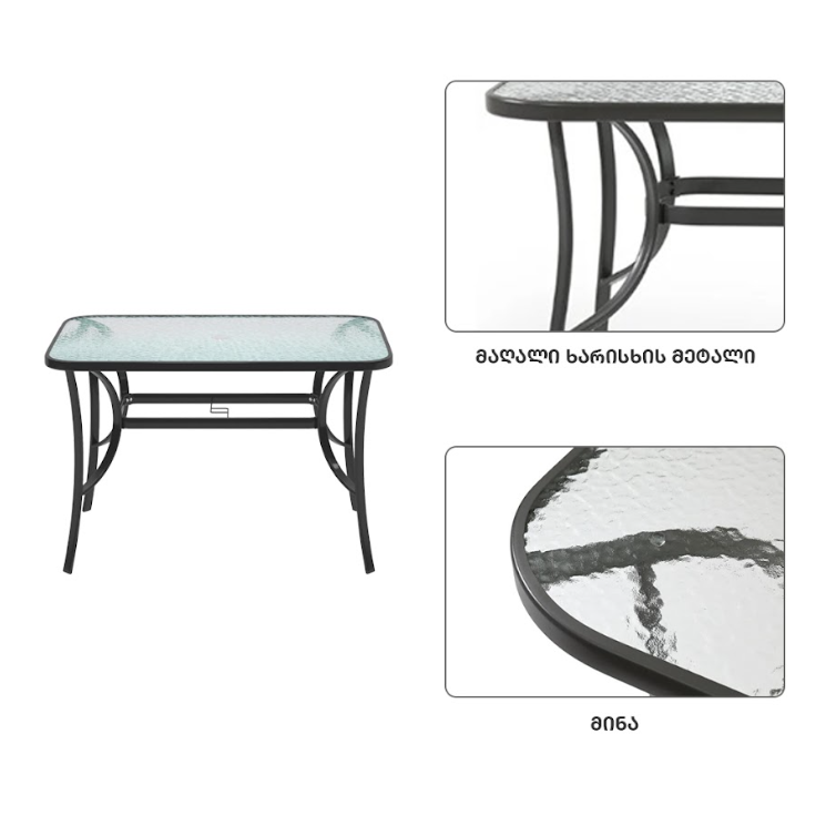 ნაკრებში შედის 1 მაგიდა, ქოლგის სამაგრით ზომით : 120*70*70