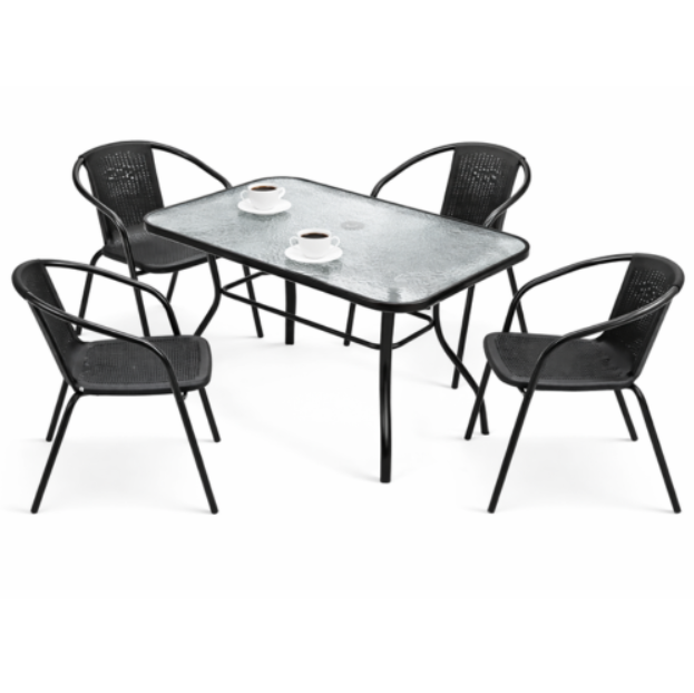 ნაწრთობი მინის მაგიდისა და მოწნული იმიტაციის,პლასტმასის სკამების კომპლექტი მეტალის კარკასით თქვენს ინტერიერსა თუ ექსტერიერს შესძენს მყუდროებას და გამორჩეულ დიზაინს.