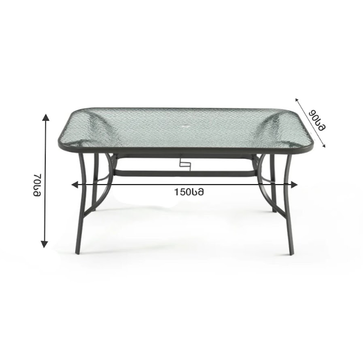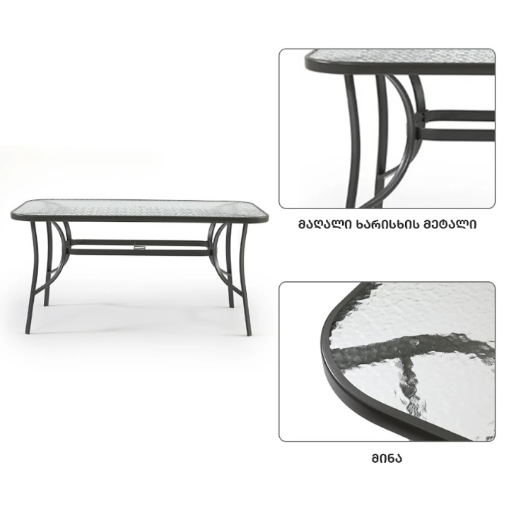 ნაწრთობი მინის მაგიდა, მეტალის სკამებით თქვენს ინტერიერსა თუ ექსტერიერს შესძენს მყუდროებას და გამორჩეულ დიზაინს. ნაკრებში შედის 1 მაგიდა ზომით : 150*70*70 |