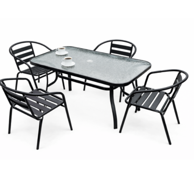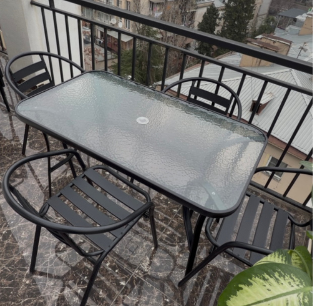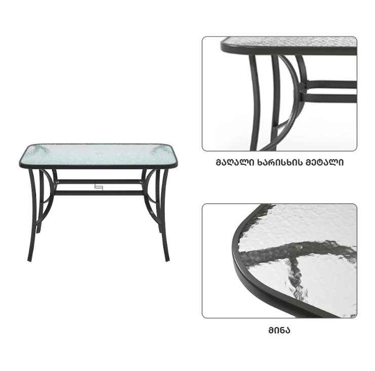 ნაწრთობი მინის მაგიდა, მეტალის სკამებით თქვენს ინტერიერსა თუ ექსტერიერს შესძენს მყუდროებას და გამორჩეულ დიზაინს.