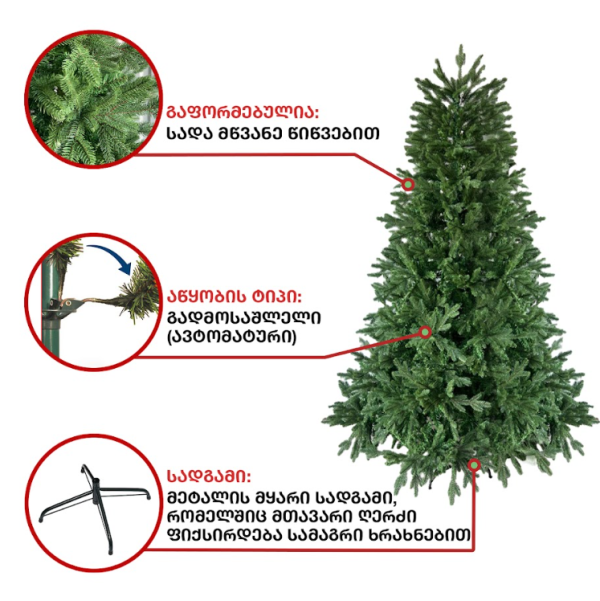 ბუნებრივის მსგავსი ნაძვის ხე,  დრეკადი მეტალის ტოტებით და ჯანმრთელობისთვის უსაფრთხო მასალისგან დამზადებული შერეული ორი სახეობის სილიკონის და PVC წიწვით . მეტალის მყარი სადგამით და მთავარი ღერძით. ბუნებრივის მსგავსი