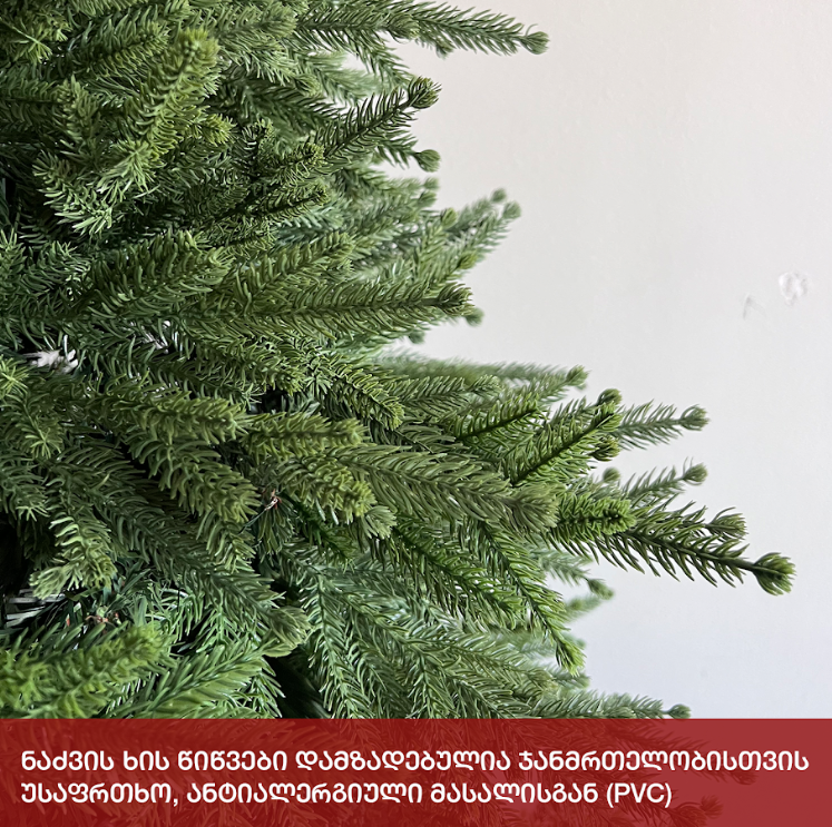ბუნებრივის მსგავსი ნაძვის ხე, დრეკადი მეტალის ტოტებით და ჯანმრთელობისთვის უსაფრთხო მასალისგან დამზადებული შერეული ორი ფერის, სილიკონის და PVC წიწვით . მეტალის მყარი სადგამით და მთავარი ღერძით. ბუნებრივის მსგავსი