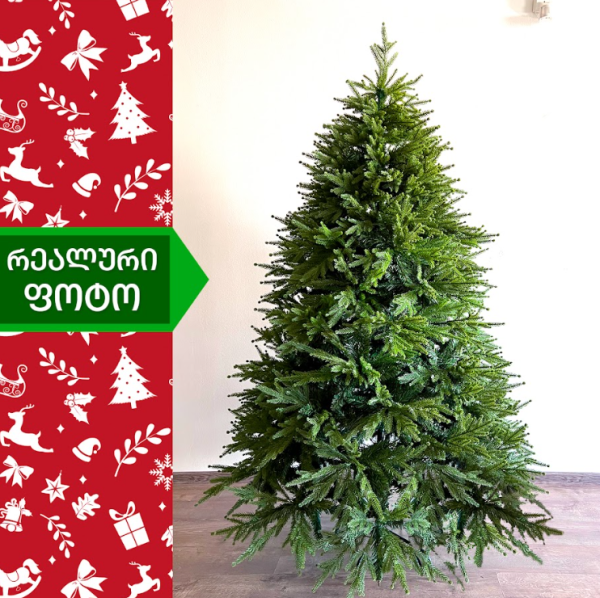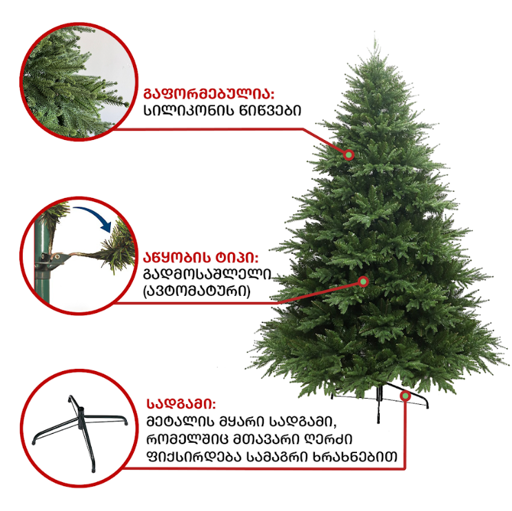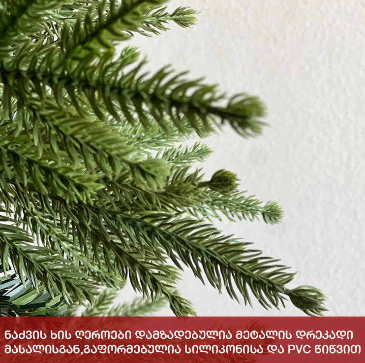 ბუნებრივის მსგავსი ნაძვის ხე,  დრეკადი მეტალის ტოტებით და ჯანმრთელობისთვის უსაფრთხო მასალისგან დამზადებული შერეული ორი ფერის, სილიკონის და PVC წიწვით . მეტალის მყარი სადგამით და მთავარი ღერძით. ბუნებრივის მსგავსი
