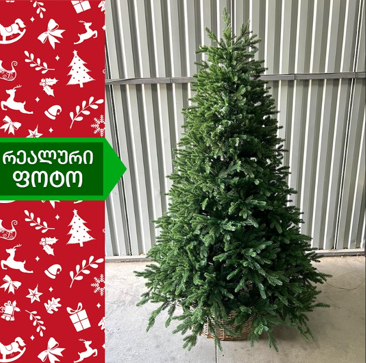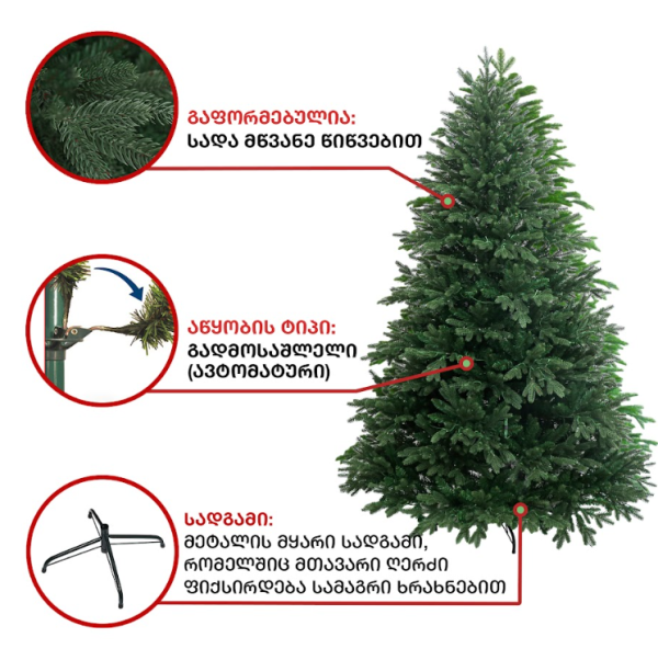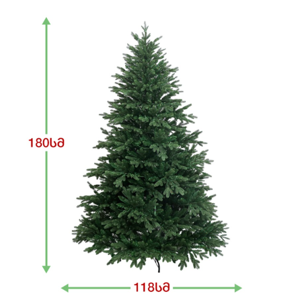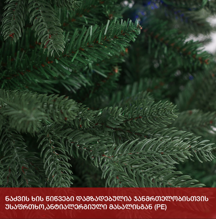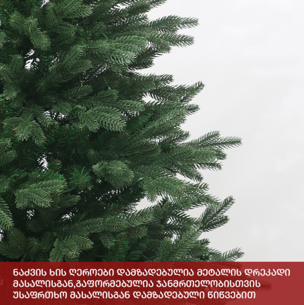 ბუნებრივის მსგავსი მწვანე ნაძვის ხე, დამზადებული 100% სილიკონის წიწვებით. გამძლე დრეკადი მეტალის ტოტებით და ჯანმრთელობისთვის უსაფრთხო მასალისგან დამზადებული წიწვებით. მეტალის მყარი სადგამით და მთავარი ღერძით. ბუნებრივის მსგავსი, 100% სილიკონი