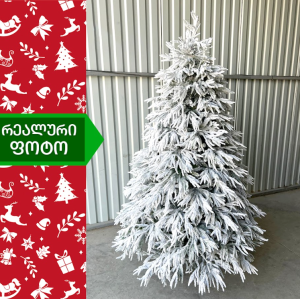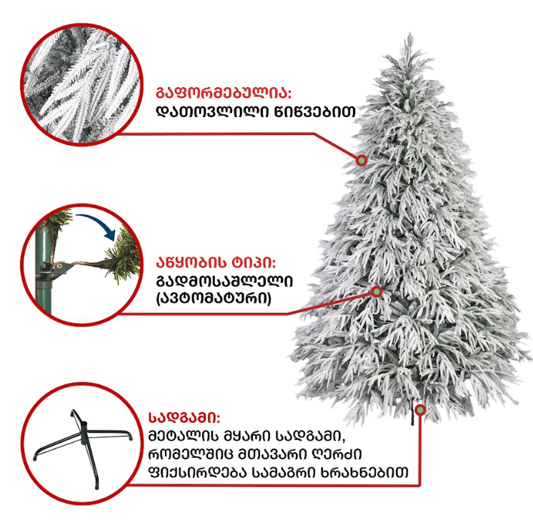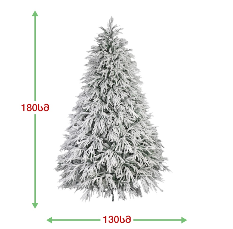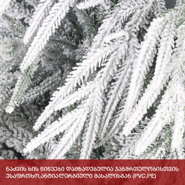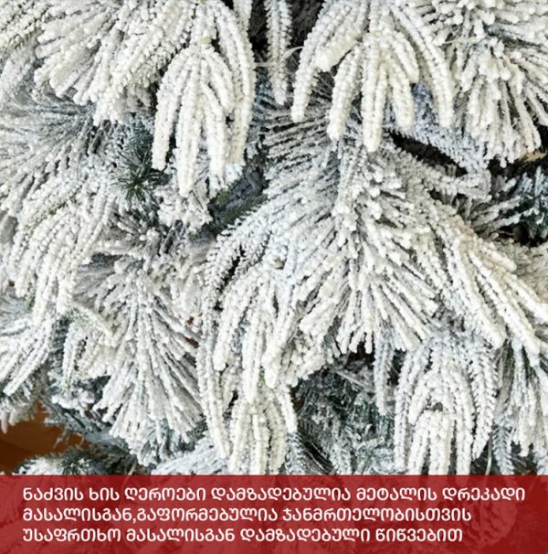 ბუნებრივის მსგავსი დათოვლილი ნაძვის ხე, დრეკადი მეტალის ტოტებით და ჯანმრთელობისთვის უსაფრთხო მასალისგან დამზადებული შერეული ორი სახეობის სილიკონის და PVC წიწვით . მეტალის მყარი სადგამით და მთავარი ღერძით. ბუნებრივის მსგავსი, დათოვლილი