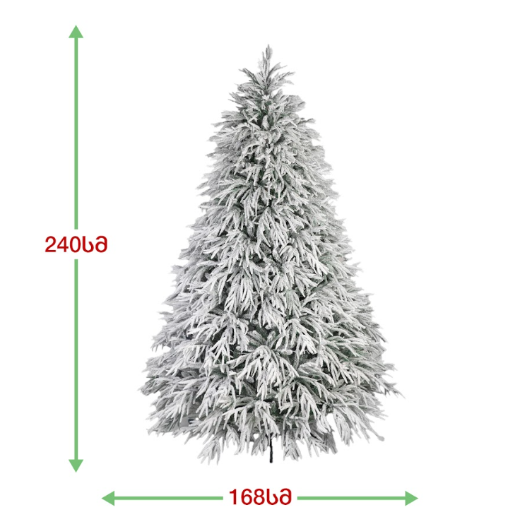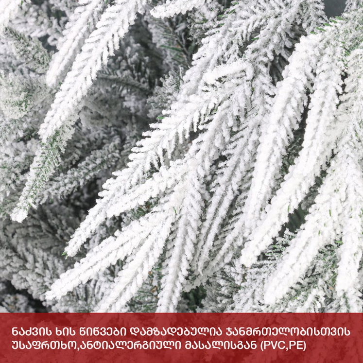 ბუნებრივის მსგავსი დათოვლილი ნაძვის ხე,  დრეკადი მეტალის ტოტებით და ჯანმრთელობისთვის უსაფრთხო მასალისგან დამზადებული შერეული ორი სახეობის სილიკონის და PVC წიწვით . მეტალის მყარი სადგამით და მთავარი ღერძით. ბუნებრივის მსგავსი, დათოვლილი
