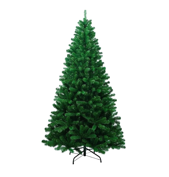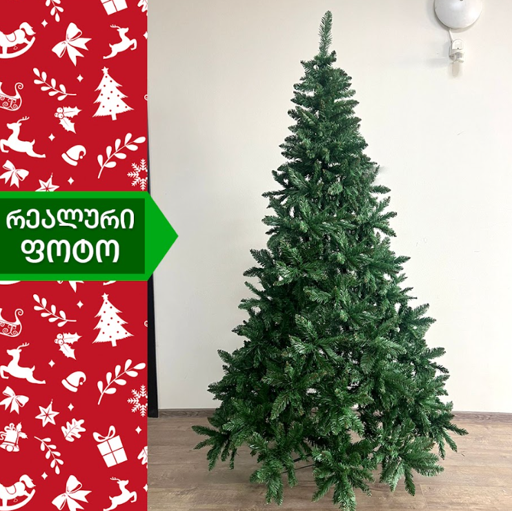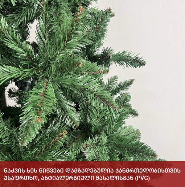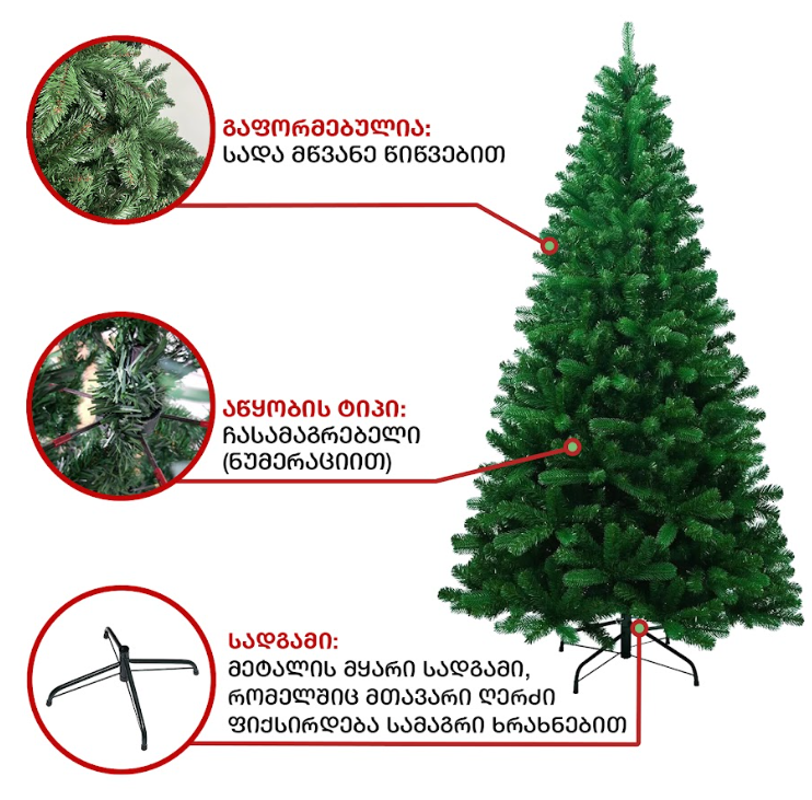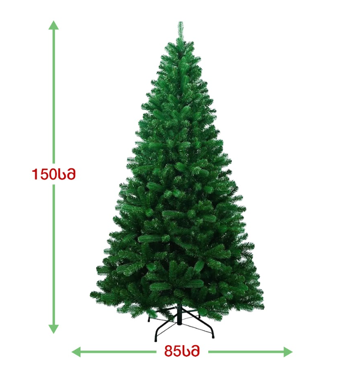 სადა მწვანე ნაძვის ხე გამძლე დრეკადი მეტალის ტოტებით და ჯანმრთელობისთვის უსაფრთხო მასალისგან დამზადებული წიწვებით. მეტალის მყარი სადგამით და მთავარი ღერძით. სადა მწვანე