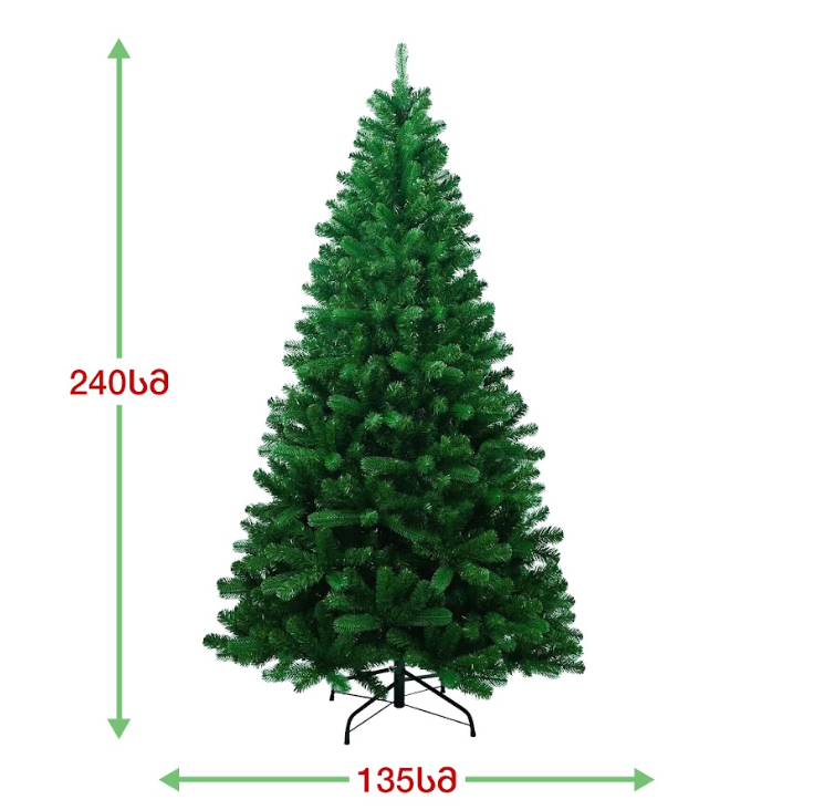 სადა მწვანე ნაძვის ხე გამძლე დრეკადი მეტალის ტოტებით და ჯანმრთელობისთვის უსაფრთხო მასალისგან დამზადებული წიწვებით. მეტალის მყარი სადგამით და მთავარი ღერძით. სადა მწვანე
