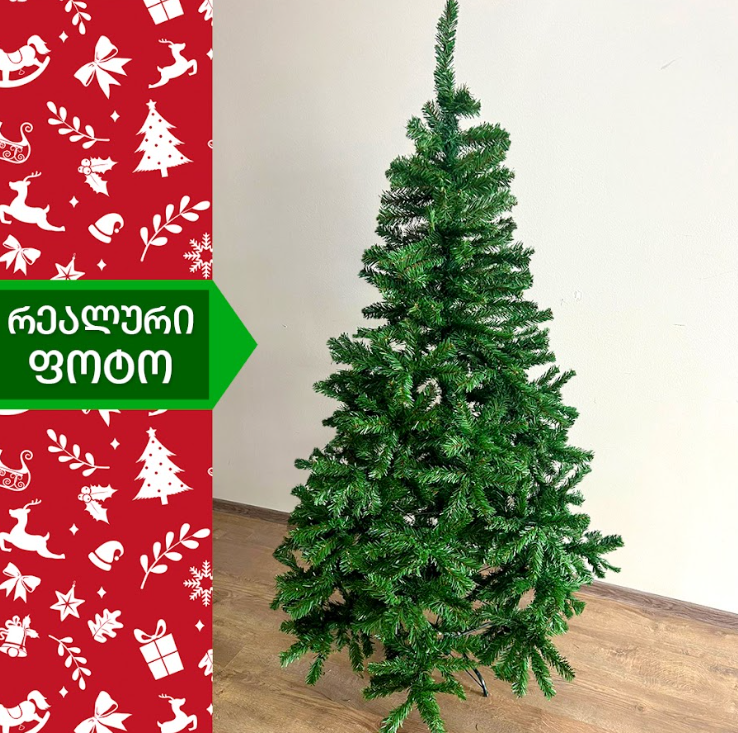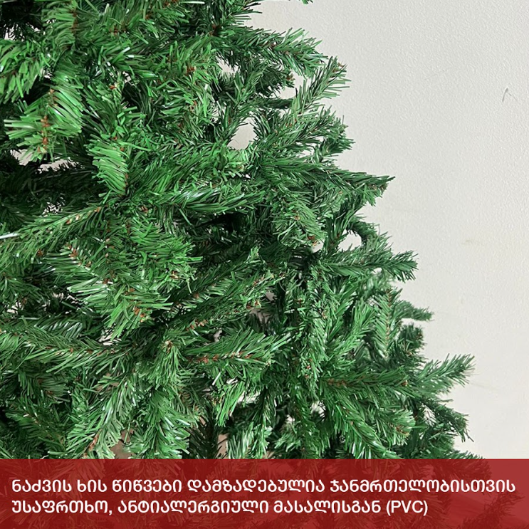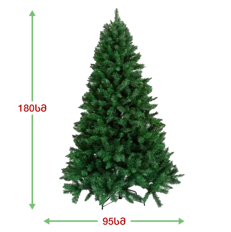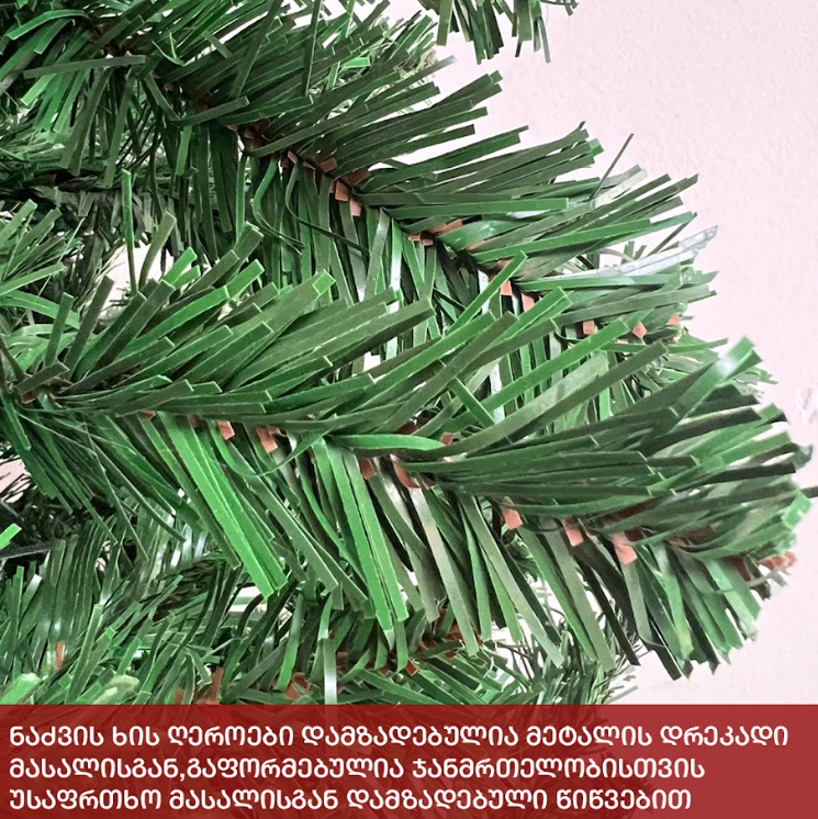 სადა მწვანე ნაძვის ხე გამძლე დრეკადი მეტალის ტოტებით და ჯანმრთელობისთვის უსაფრთხო მასალისგან დამზადებული წიწვებით. მეტალის მყარი სადგამით და მთავარი ღერძით. სადა მწვანე