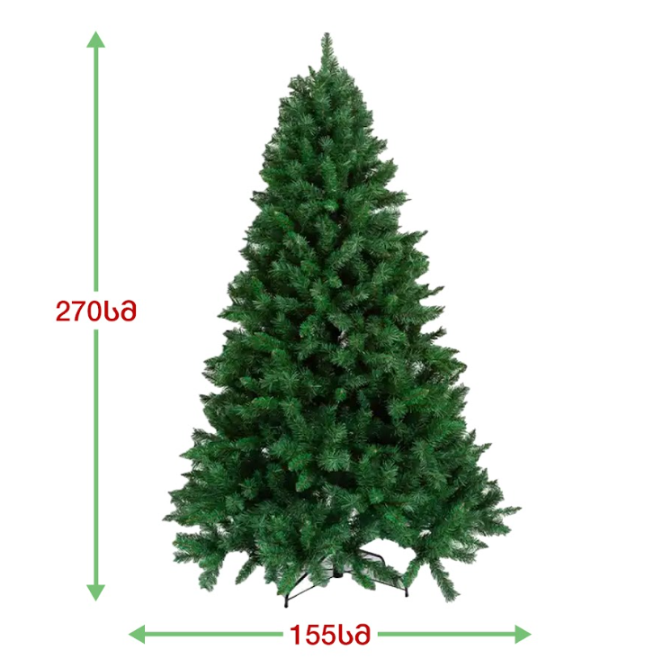 სადა მწვანე ნაძვის ხე გამძლე დრეკადი მეტალის ტოტებით და ჯანმრთელობისთვის უსაფრთხო მასალისგან დამზადებული წიწვებით. მეტალის მყარი სადგამით და მთავარი ღერძით. სადა მწვანე