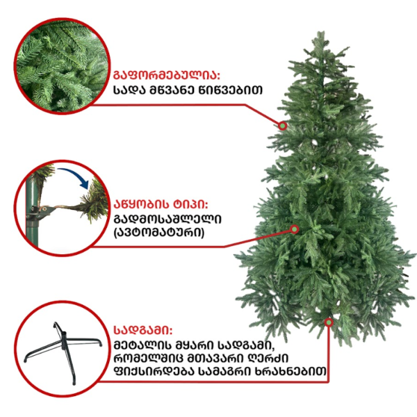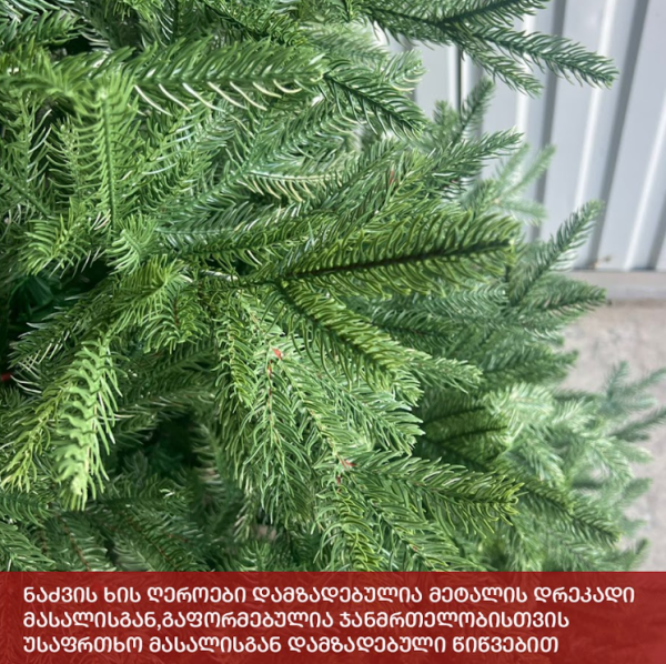 ბუნებრივის მსგავსი მწვანე ნაძვის ხე, დამზადებული 100% სილიკონის წიწვებით.  გამძლე დრეკადი მეტალის ტოტებით და ჯანმრთელობისთვის უსაფრთხო მასალისგან დამზადებული წიწვებით. მეტალის მყარი სადგამით და მთავარი ღერძით. ბუნებრივის მსგავსი