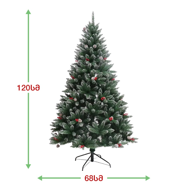 ნაძვის ხე დათოვლილი ბოლოებით, გაფორმებული გირჩებით და კენკრით. გამძლე დრეკადი მეტალის ტოტებით და ჯანმრთელობისთვის უსაფრთხო მასალისგან დამზადებული წიწვებით. მეტალის მყარი სადგამით და მთავარი ღერძით. დათოვლილი;გირჩებით და კენკრით