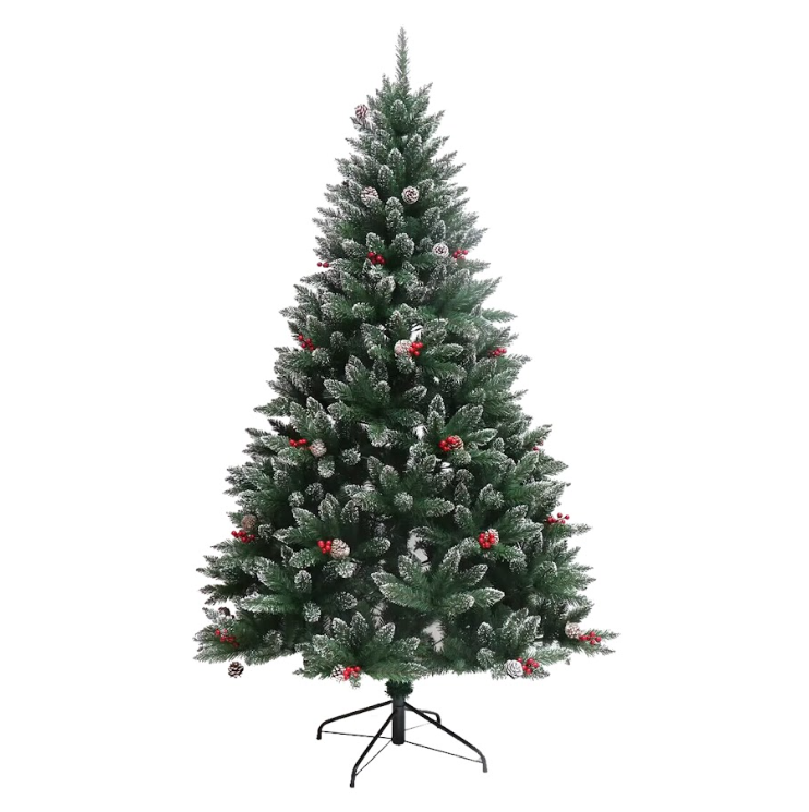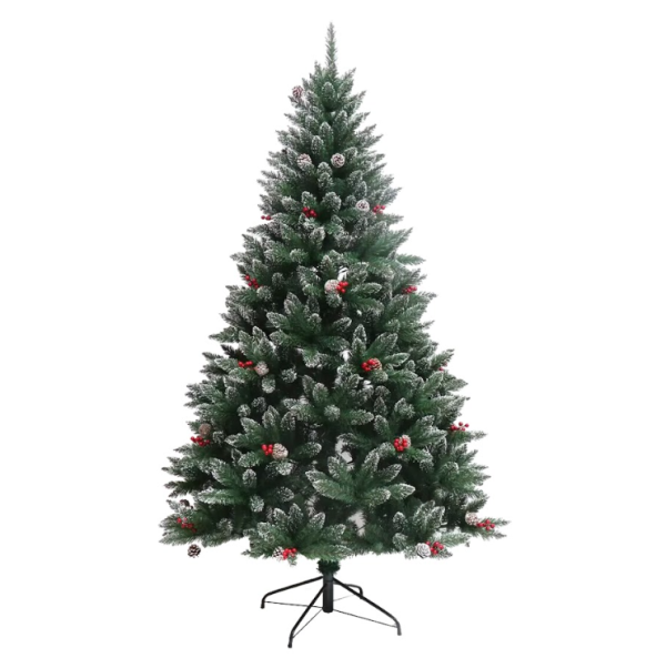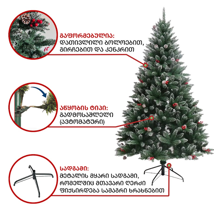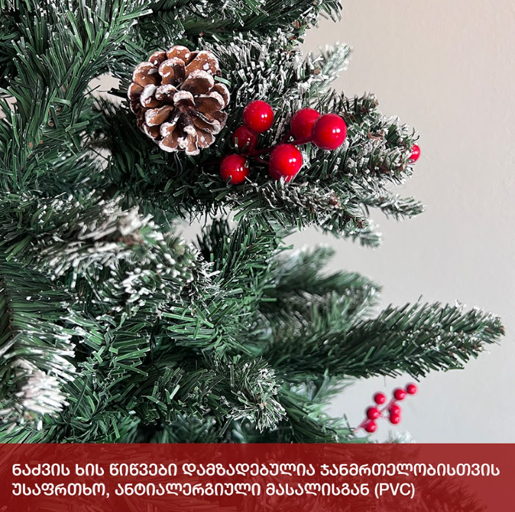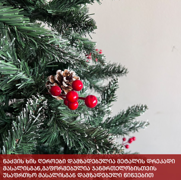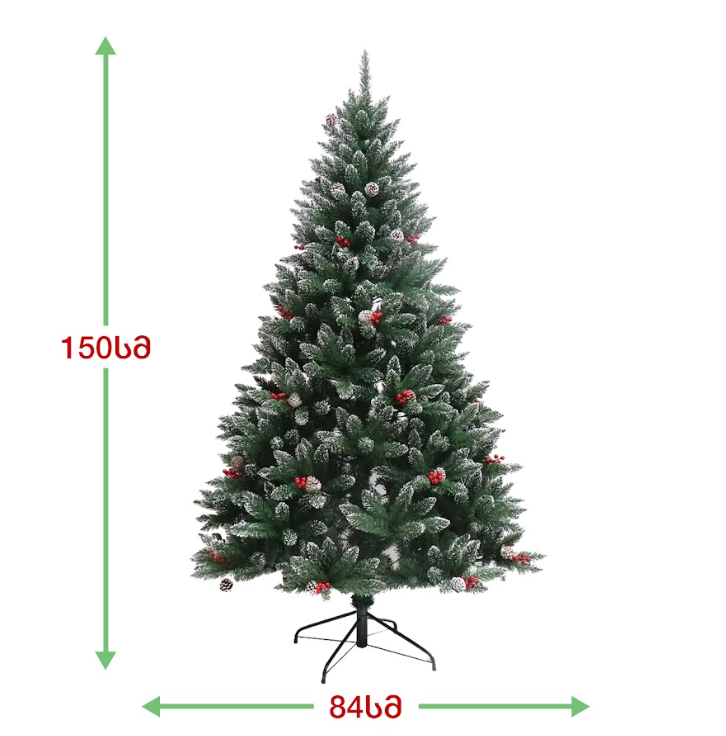 ნაძვის ხე დათოვლილი ბოლოებით, გაფორმებული გირჩებით და კენკრით. გამძლე დრეკადი მეტალის ტოტებით და ჯანმრთელობისთვის უსაფრთხო მასალისგან დამზადებული წიწვებით. მეტალის მყარი სადგამით და მთავარი ღერძით. დათოვლილი;გირჩებით და კენკრით