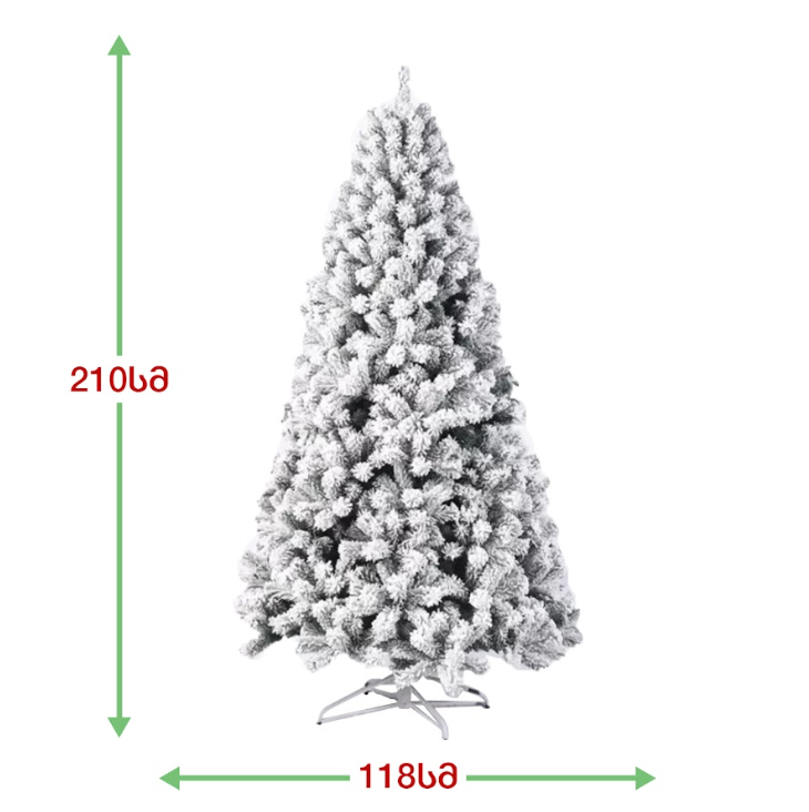 დათოვლილი ნაძვის ხე, დრეკადი მეტალის ტოტებით და ჯანმრთელობისთვის უსაფრთხო მასალისგან დამზადებული PVC წიწვით . მეტალის მყარი სადგამით და მთავარი ღერძით. დათოვლილი