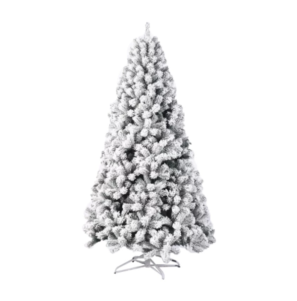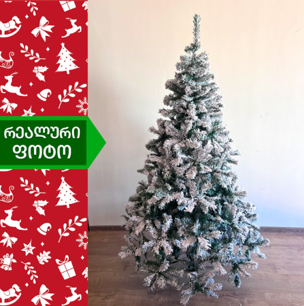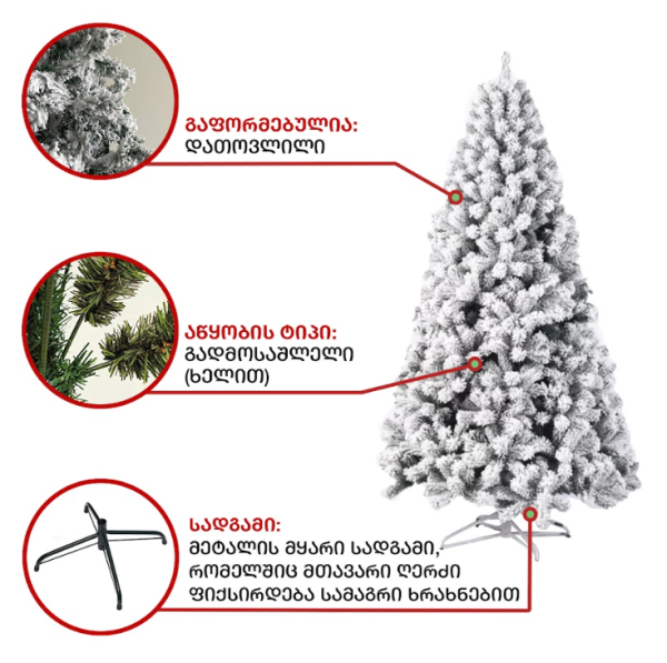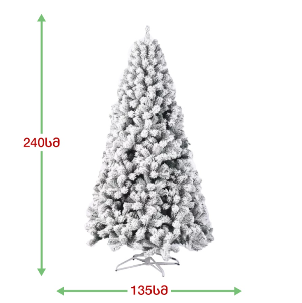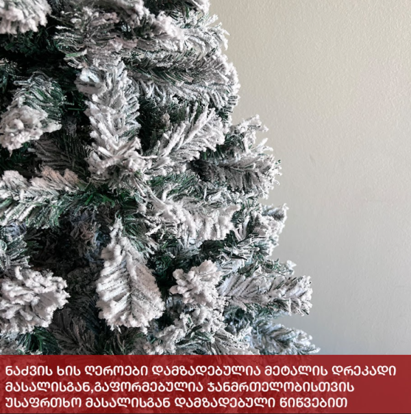 დათოვლილი ნაძვის ხე,  დრეკადი მეტალის ტოტებით და ჯანმრთელობისთვის უსაფრთხო მასალისგან დამზადებული  PVC წიწვით . მეტალის მყარი სადგამით და მთავარი ღერძით. დათოვლილი