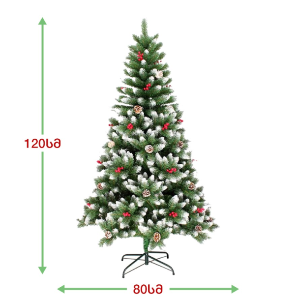 ნაძვის ხე დათოვლილი ბოლოებით, გაფორმებული გირჩებით და კენკრით. გამძლე დრეკადი მეტალის ტოტებით და ჯანმრთელობისთვის უსაფრთხო მასალისგან დამზადებული წიწვებით. მეტალის მყარი სადგამით და მთავარი ღერძით. დათოვლილი;გირჩებით და კენკრით