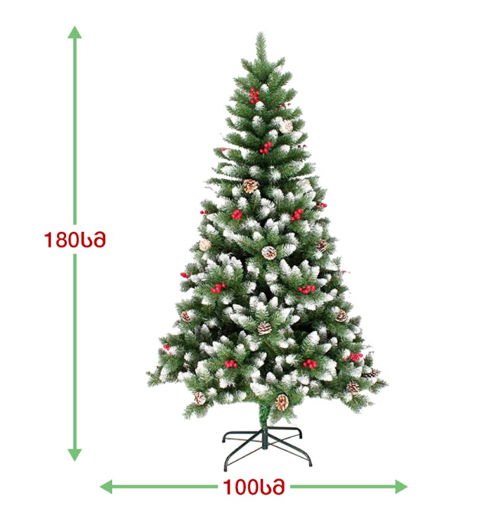 ნაძვის ხე დათოვლილი ბოლოებით, გაფორმებული გირჩებით და კენკრით. გამძლე დრეკადი მეტალის ტოტებით და ჯანმრთელობისთვის უსაფრთხო მასალისგან დამზადებული წიწვებით. მეტალის მყარი სადგამით და მთავარი ღერძით. დათოვლილი;გირჩებით და კენკრით