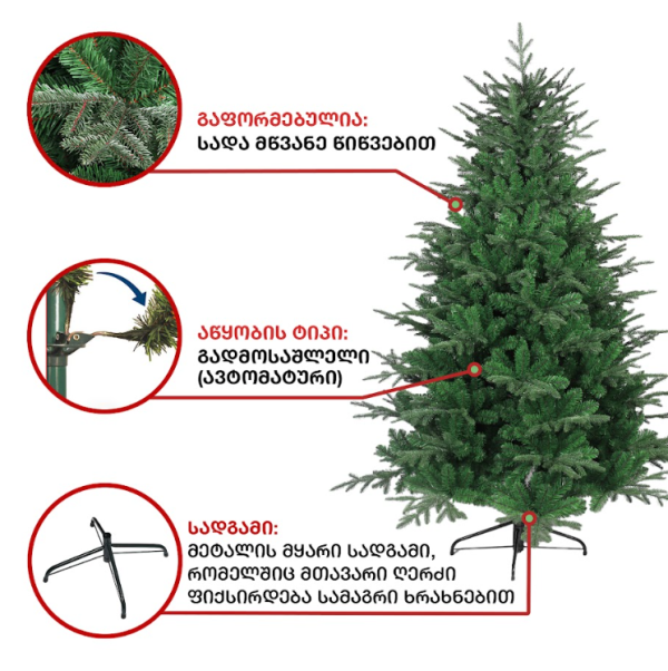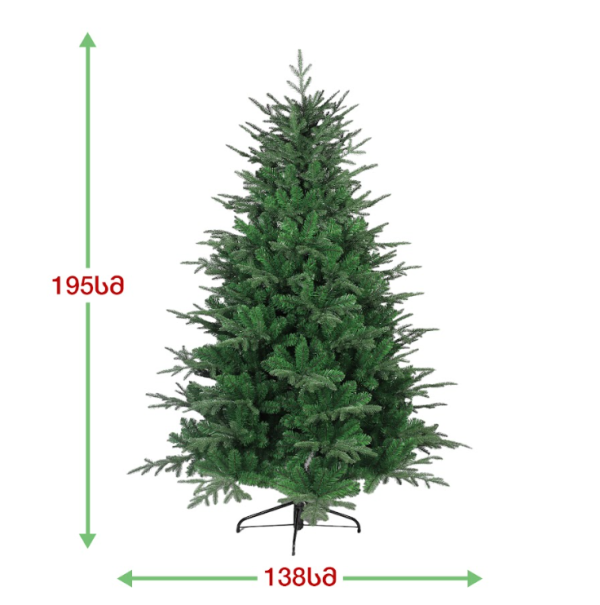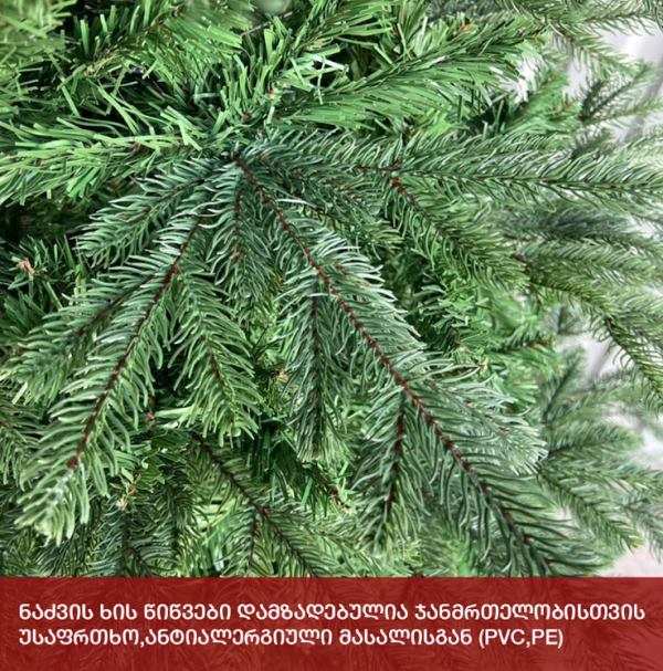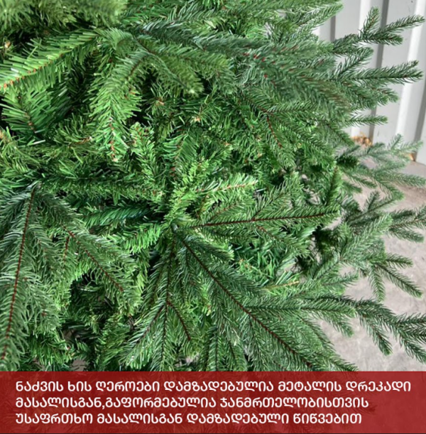 ბუნებრივის მსგავსი ნაძვის ხე, დრეკადი მეტალის ტოტებით და ჯანმრთელობისთვის უსაფრთხო მასალისგან დამზადებული შერეული ორი სახეობის სილიკონის და PVC წიწვით . მეტალის მყარი სადგამით და მთავარი ღერძით. ბუნებრივის მსგავსი