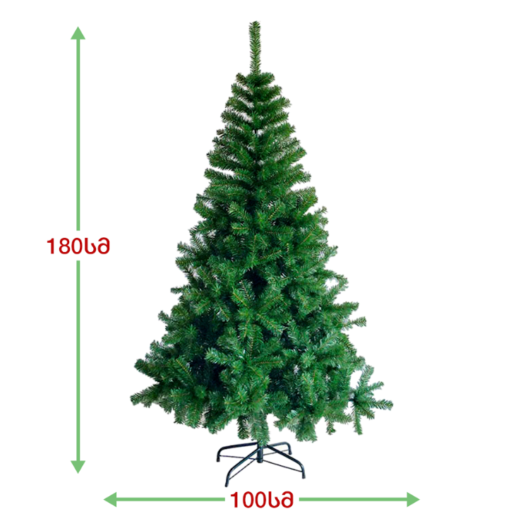 ნაძვის ხე გამძლე დრეკადი მეტალის ტოტებით და ჯანმრთელობისთვის უსაფრთხო მასალისგან დამზადებული წიწვებით. მეტალის მყარი სადგამით და მთავარი ღერძით. სადა მწვანე
