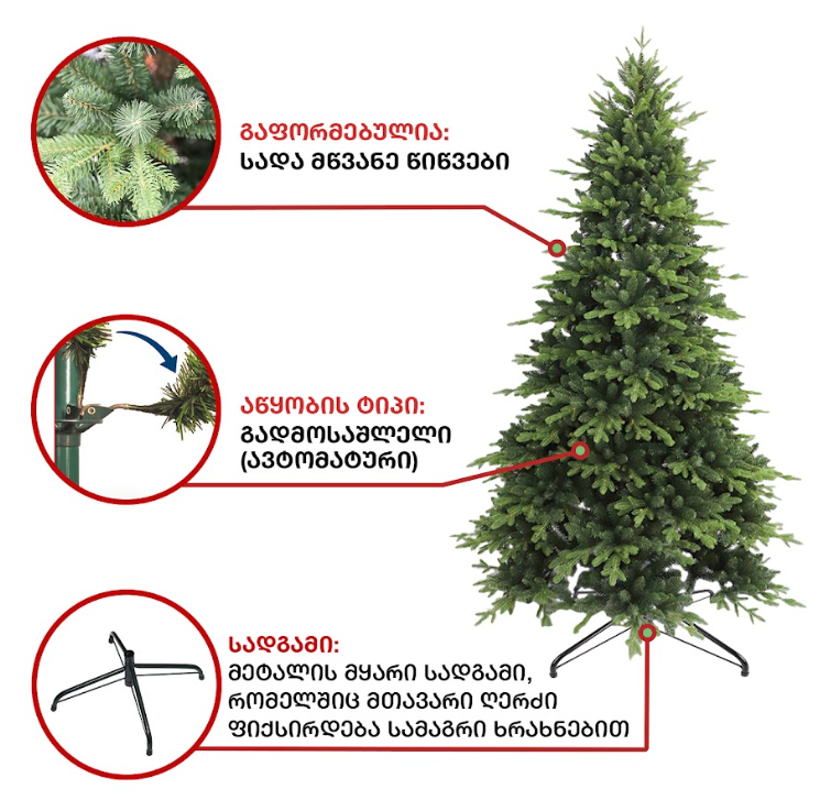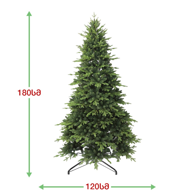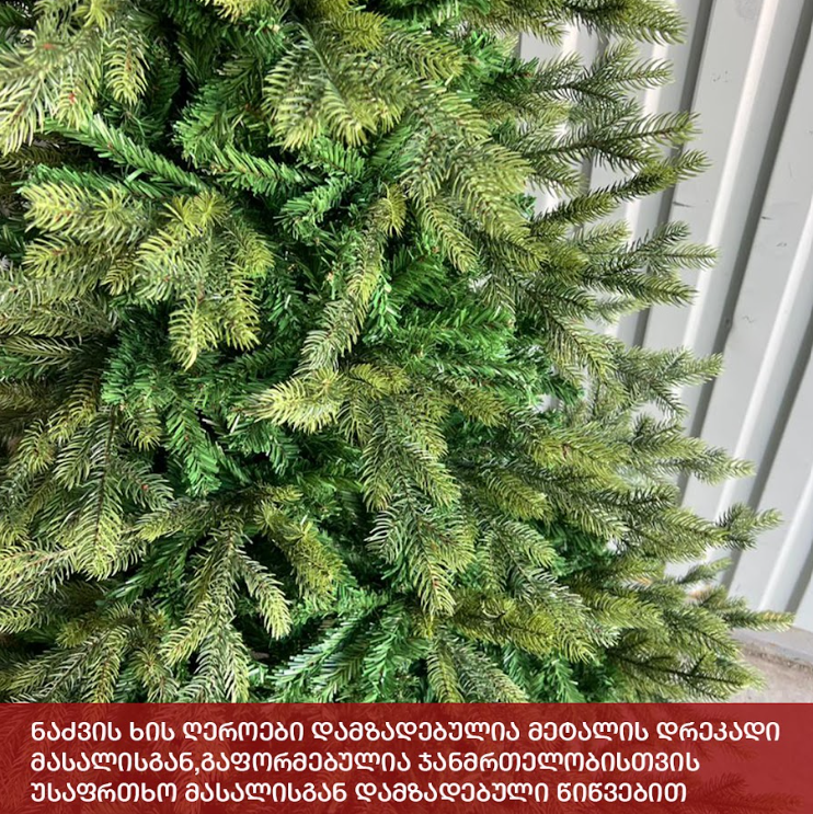 ბუნებრივის მსგავსი ნაძვის ხე, დრეკადი მეტალის ტოტებით და ჯანმრთელობისთვის უსაფრთხო მასალისგან დამზადებული შერეული ორი ფერის, სილიკონის და PVC წიწვით . მეტალის მყარი სადგამით და მთავარი ღერძით. ბუნებრივის მსგავსი