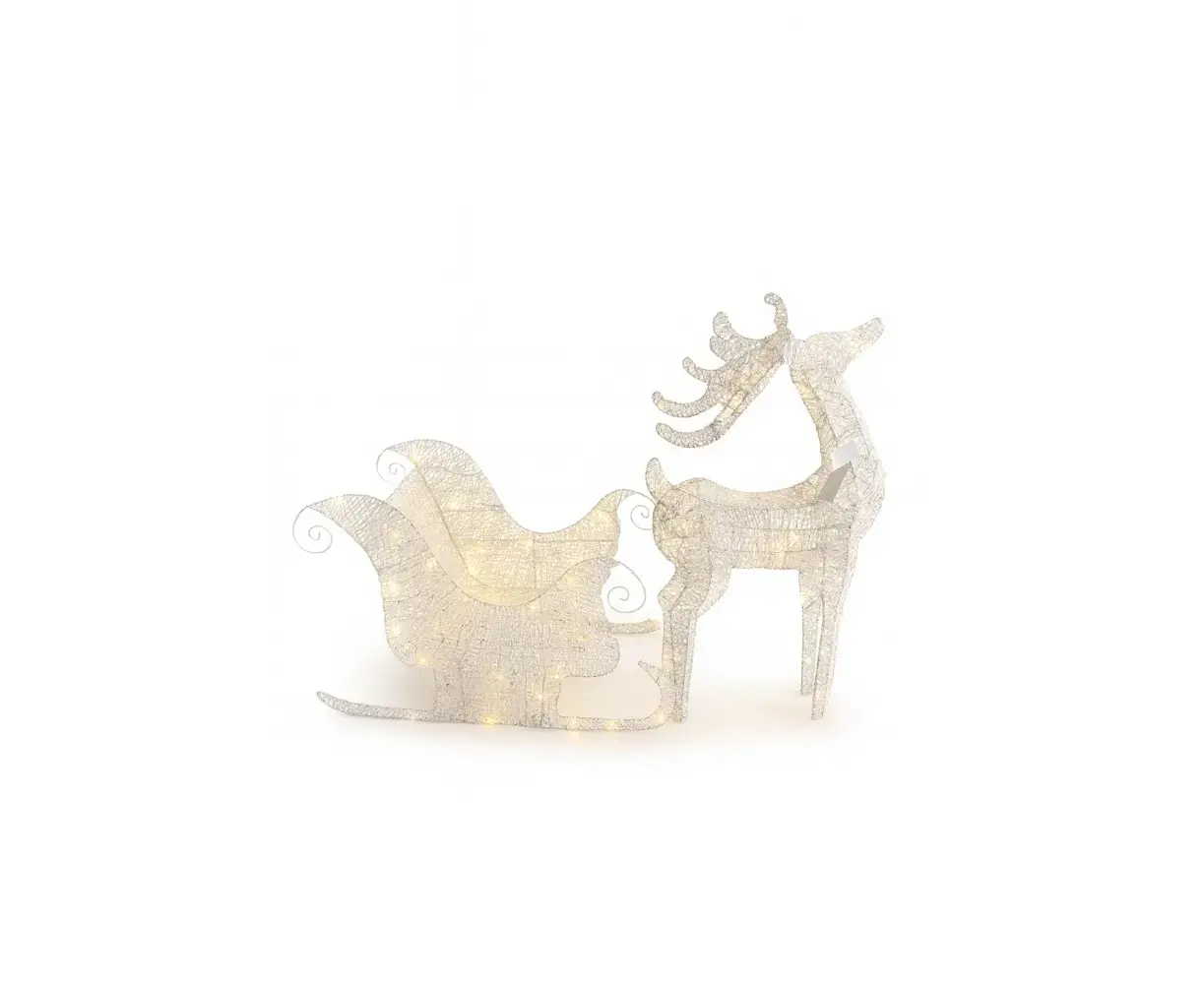 ეს ელეგანტური საახალწლო დეკორი — ირემი მარხილით, 100 სმ სიმაღლის კონსტრუქციით — დამზადებულია გამძლე, თოკით მოწნული მასალისგან და მორთულია თბილი LED განათებით. დეკორაცია იდეალურია სახლის ინტერიერისთვის, აივნებისთვის, ეზოებისთვის, კაფეებისა და სავაჭრო ობიექტების ვიტრინებისთვის. კომპოზიცია მყისიერად იქცევს ყურადღებას და გარემოს სძენს სითბოს, ჯადოსნურობას და ახალწლის განწყობას.